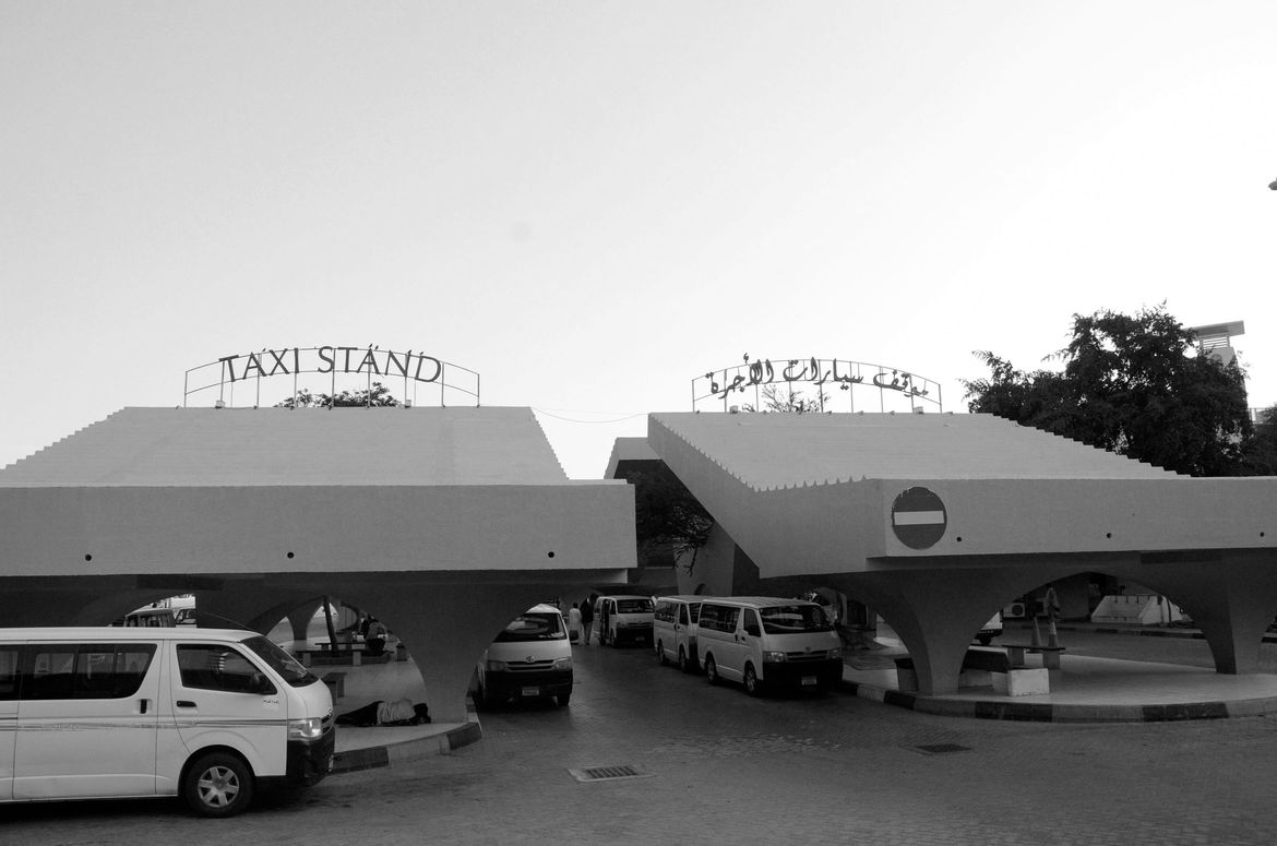 The Taxi Stand is mostly hidden away from the street, concealed on two sides by a large billboard, and on another by a line of trees. The space is entirely open air (with the exception of the two small rotunda-shaped buildings that sit off to the side). The space is enclosed in four separate islands, each hosting an identical structure. Like an opened drawbridge, the roofing of each structure slants upwards, leaving a small gap in between. The rigidity of the roof’s lines is complemented by the deep curves of its base. A tree stands between the two planks of the roofing, in the middle of each of the islands. Each tree is surrounded by a number of benches, and there are other benches facing one another. This is meant to be a social space.